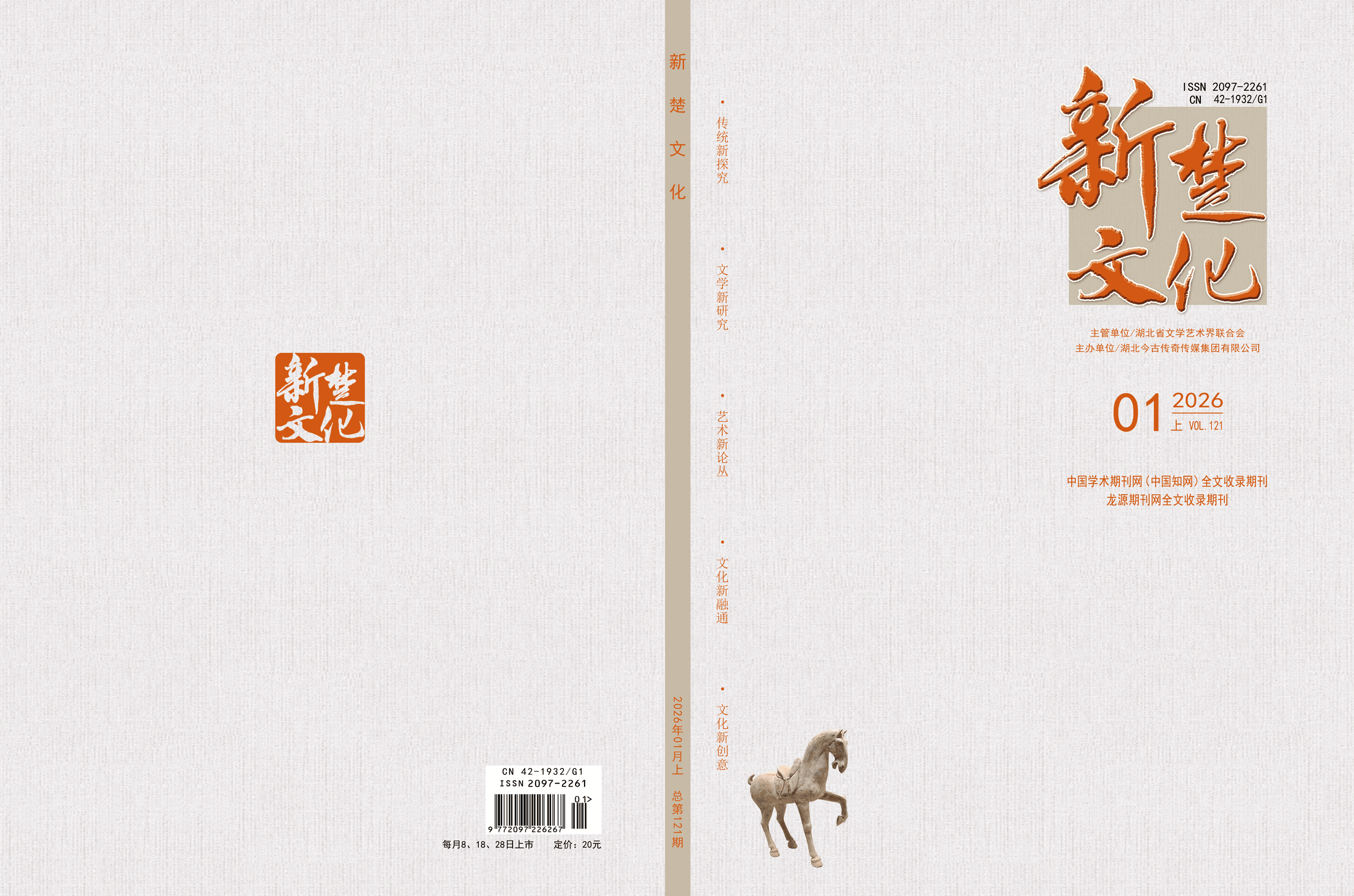 《新楚文化》杂志是由国家新闻出版总署批准、湖北省文学艺术界联合会主管、湖北今古传奇传媒集团有限公司主办,国内外公开发行的一本旬刊,国际标准出版物号:ISSN 2097-2261,连续出版物号:CN42-1932/G1,邮发代号:38-485。